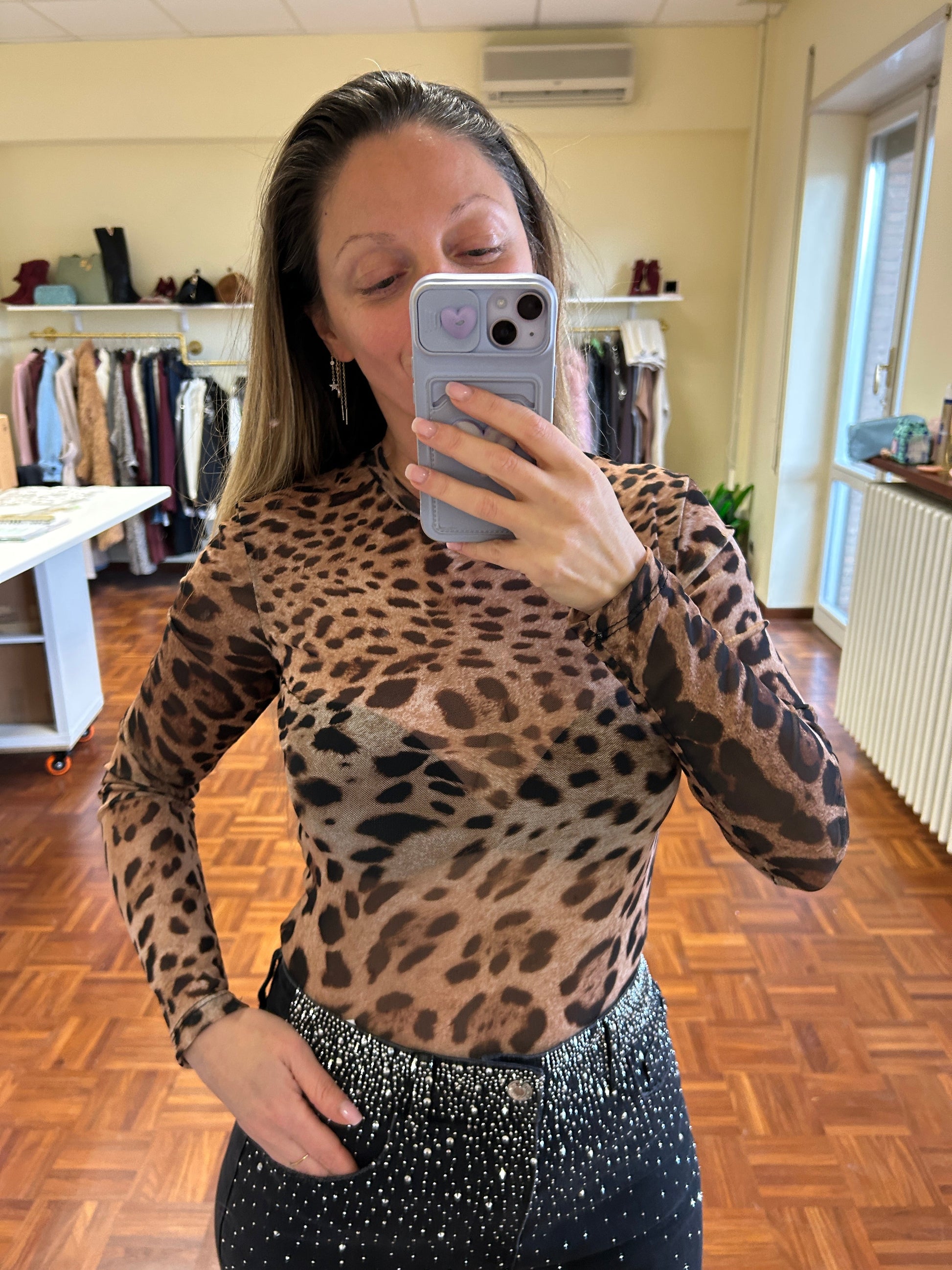 Body in stampa maculata e tessuto trasparente e molto elastico.