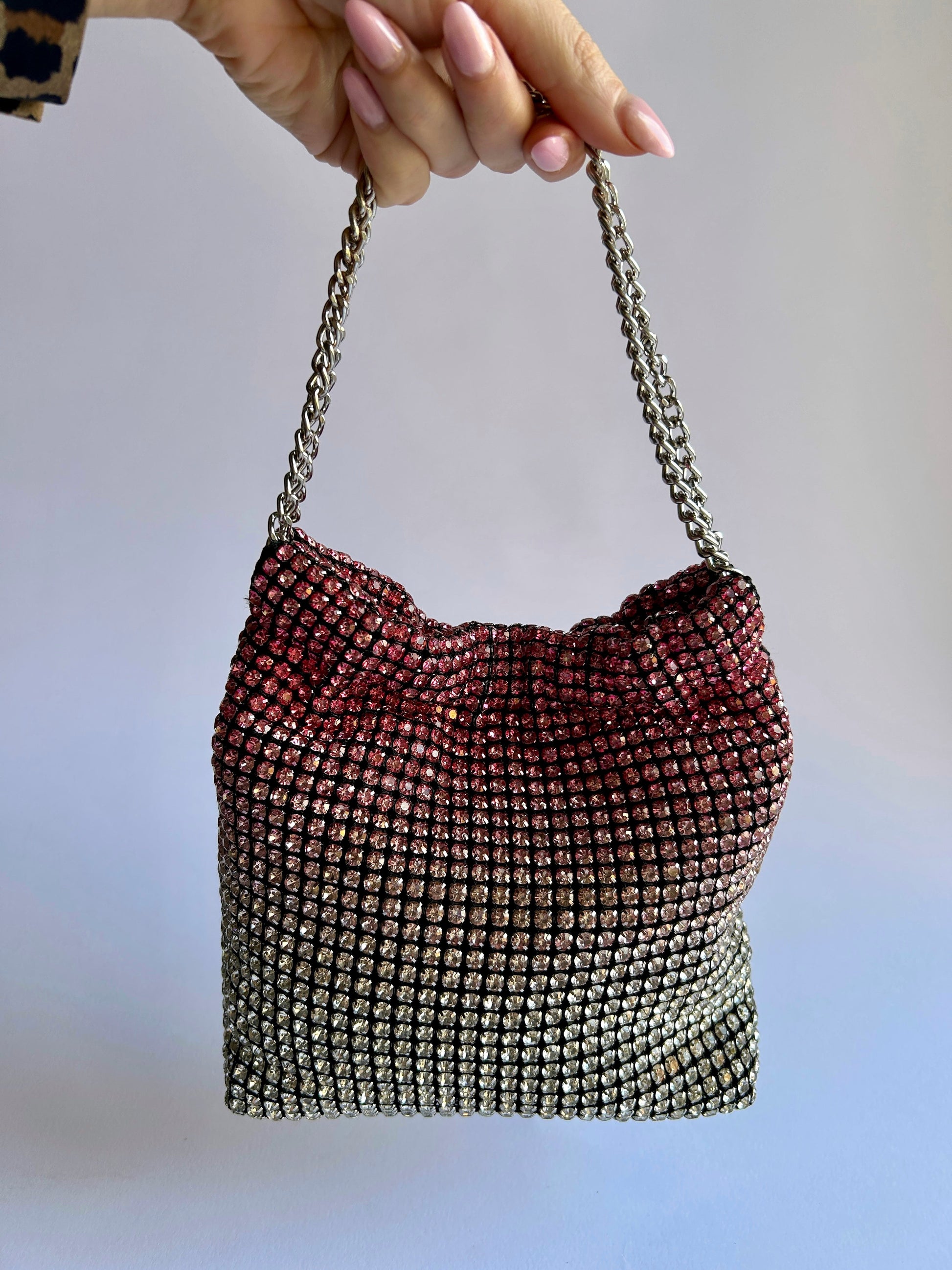 Borsa con strass sfumati bordeaux, con tracolla regolabile e magnete.