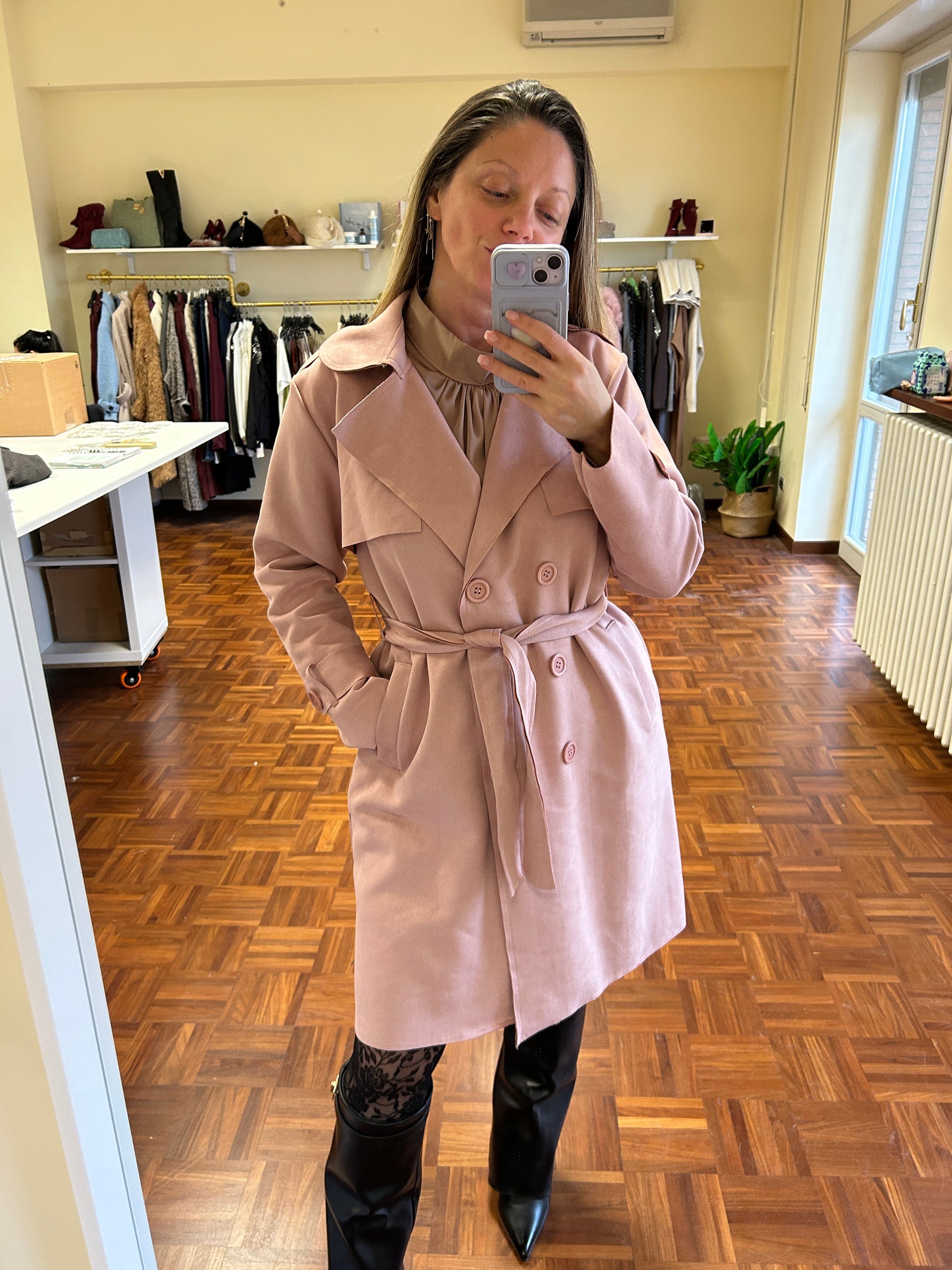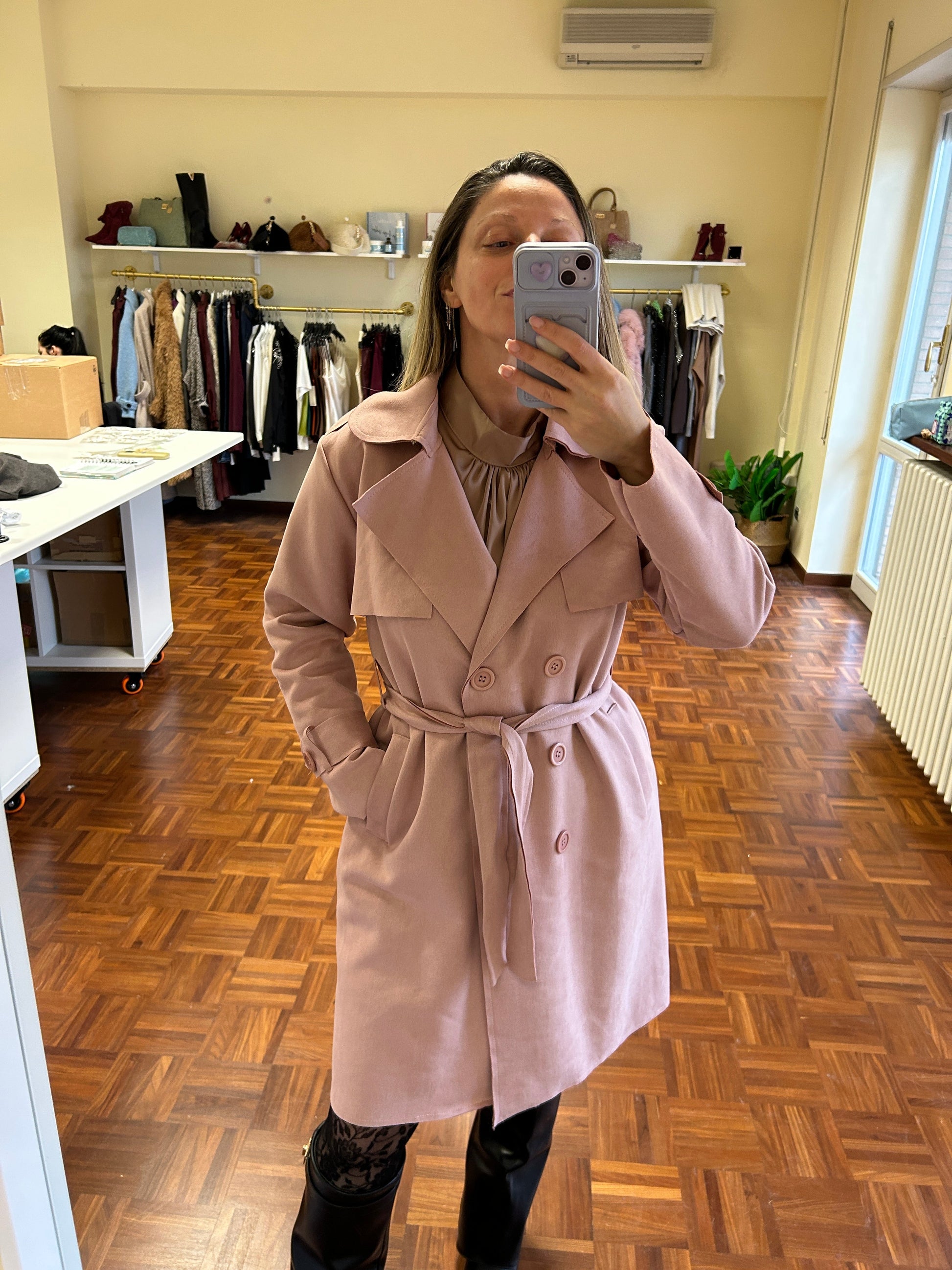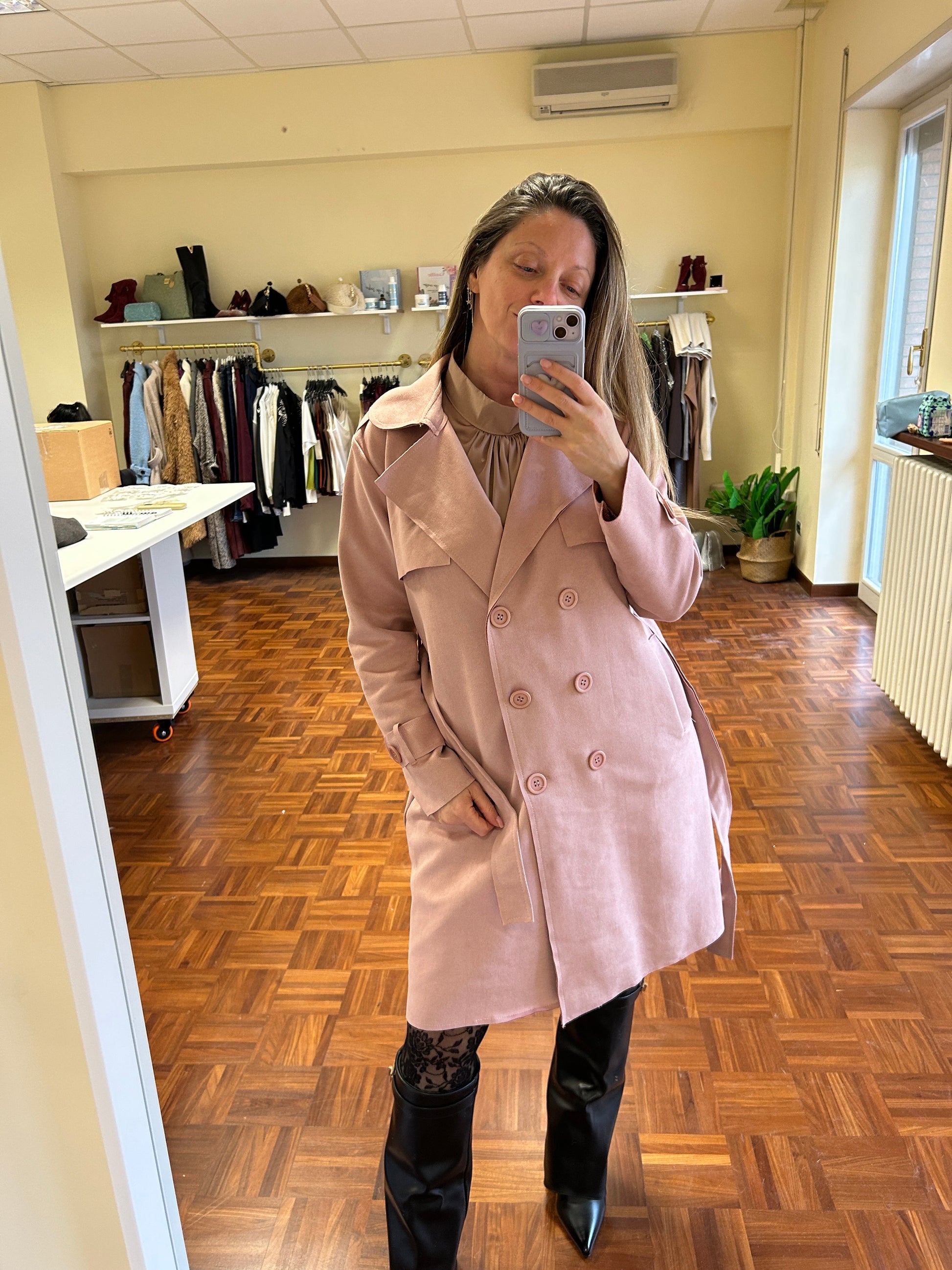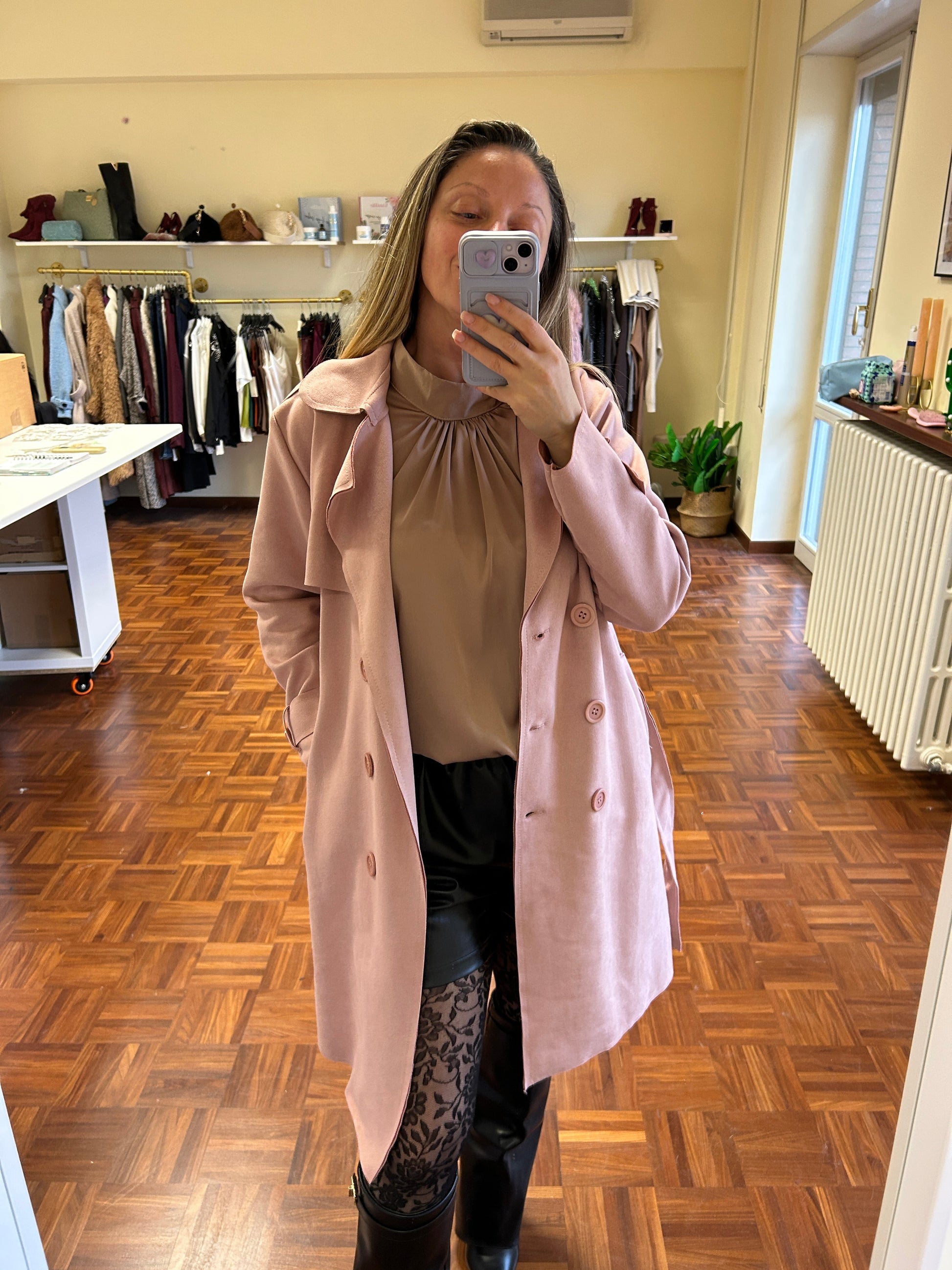 Trench rosa blush in tessuto scamosciato morbidissimo, modello spolverino