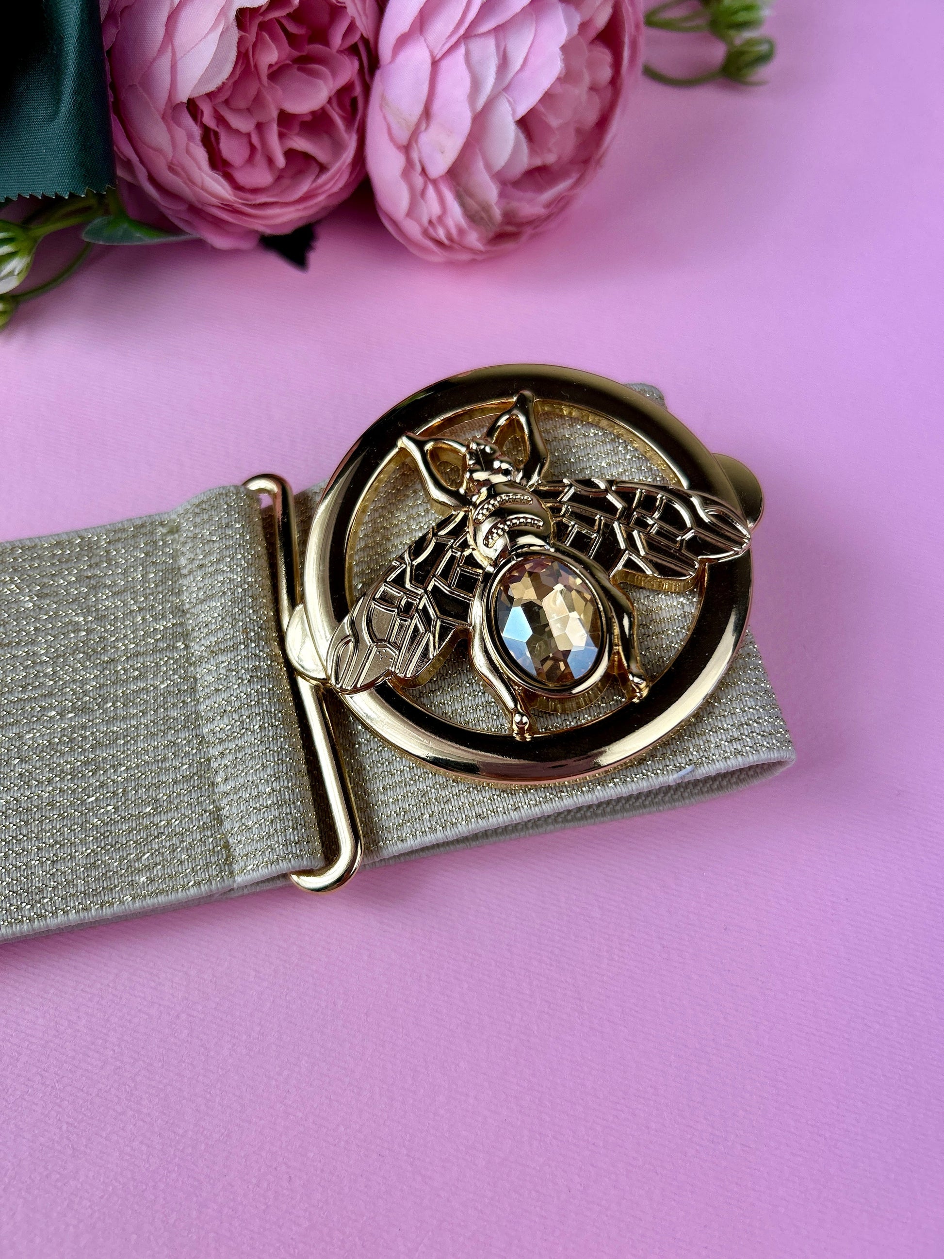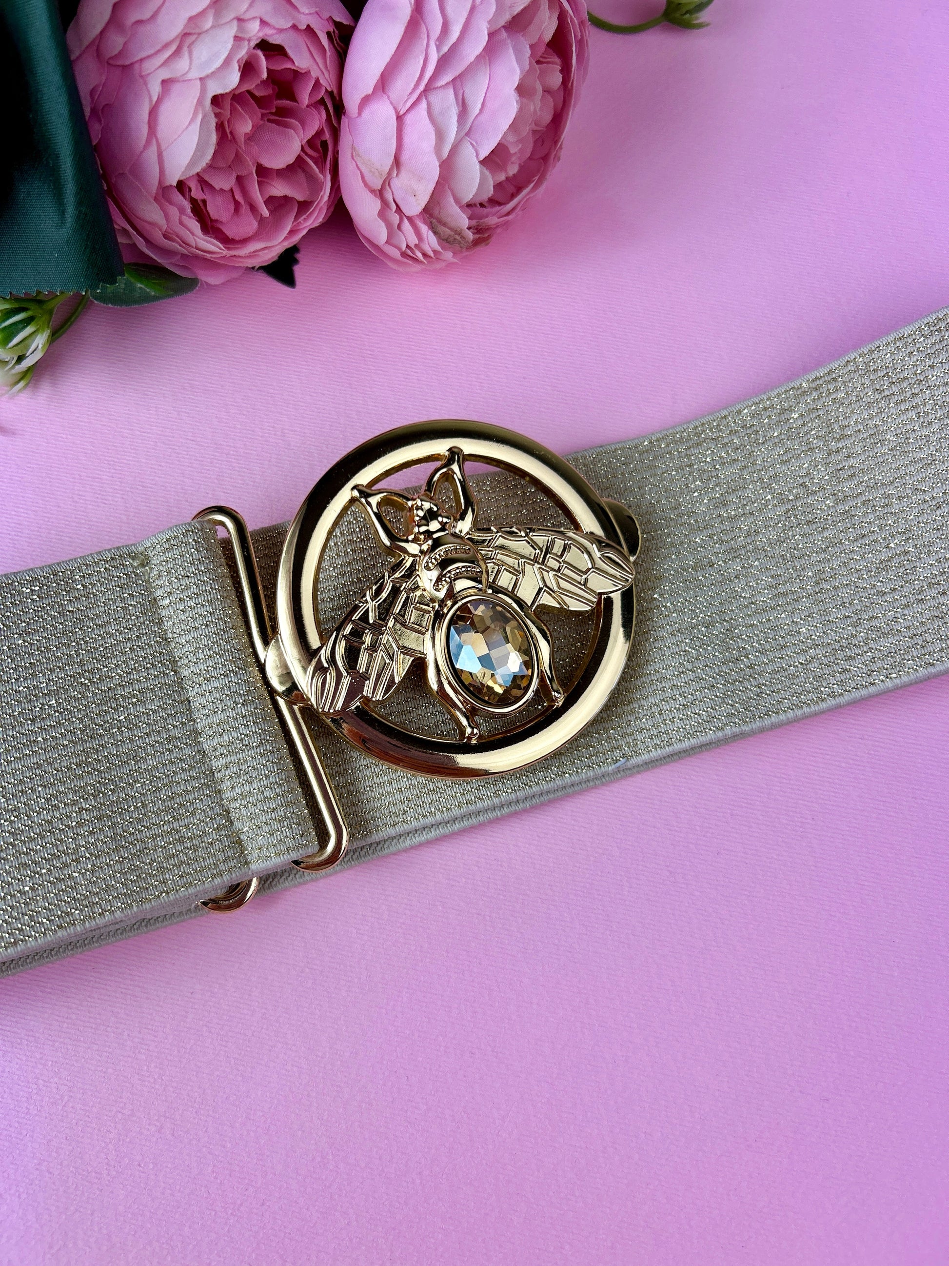 Bellissima cintura elastica, con trama dorata e fibbia gioiello a forma di ape.