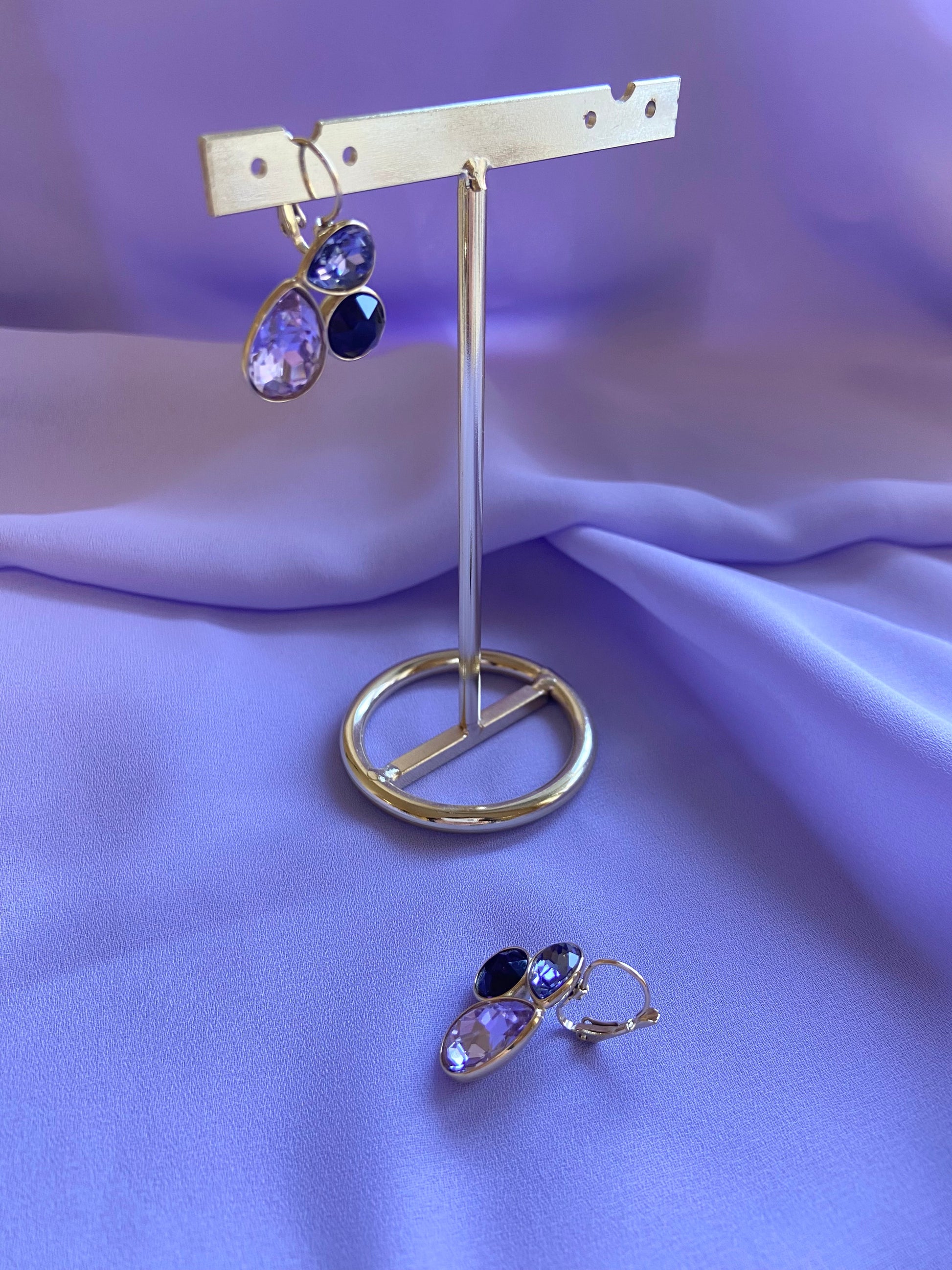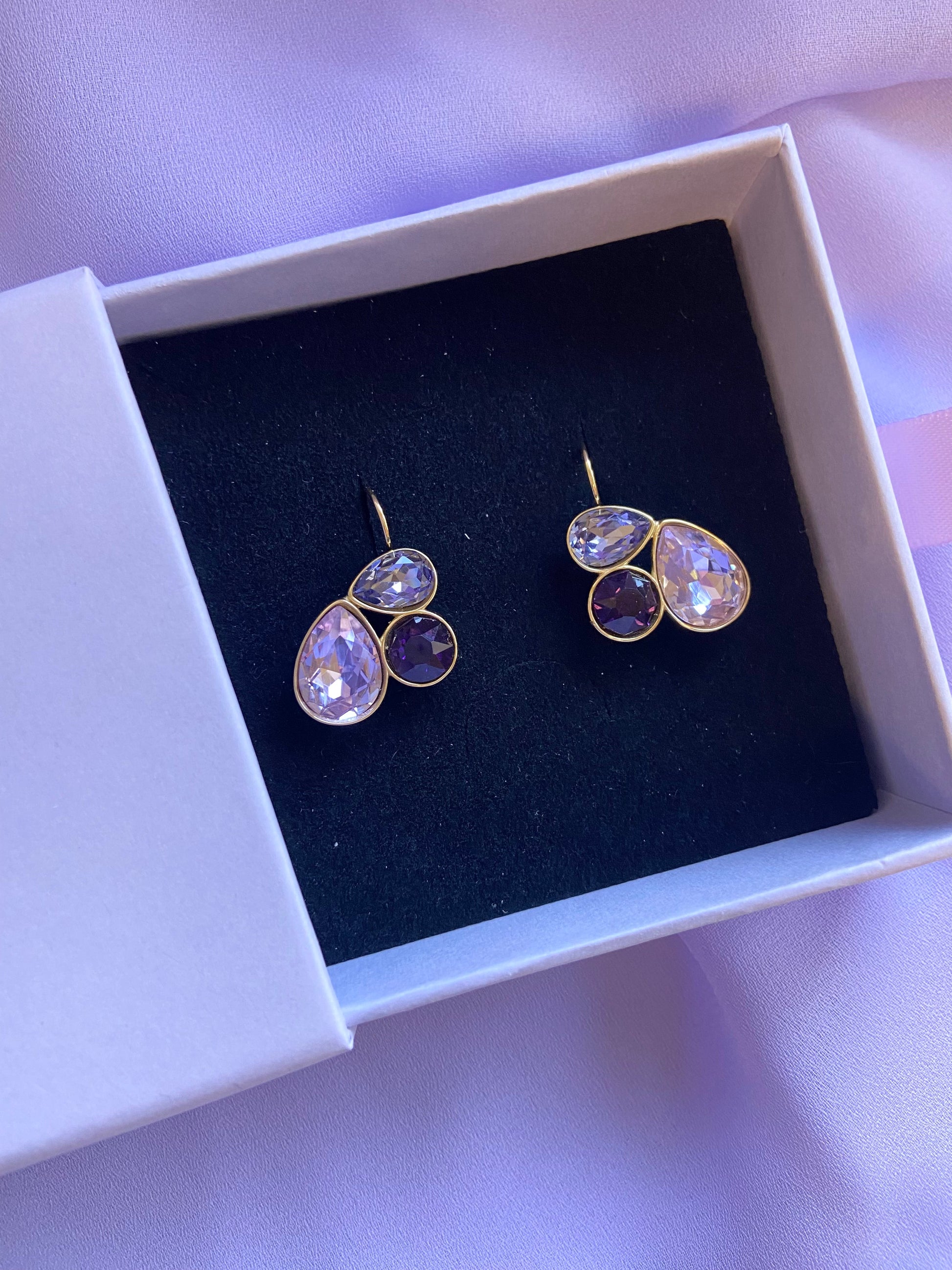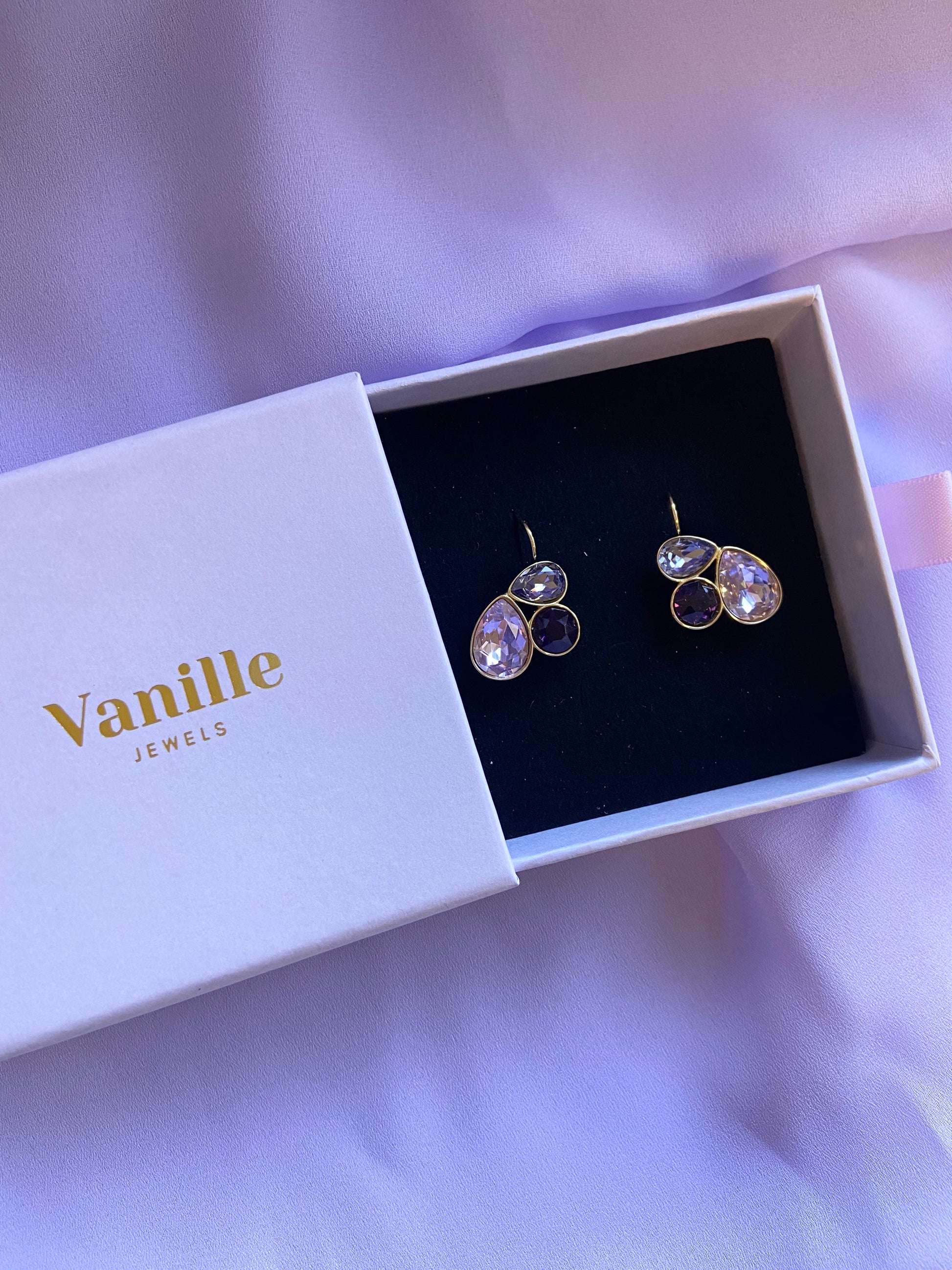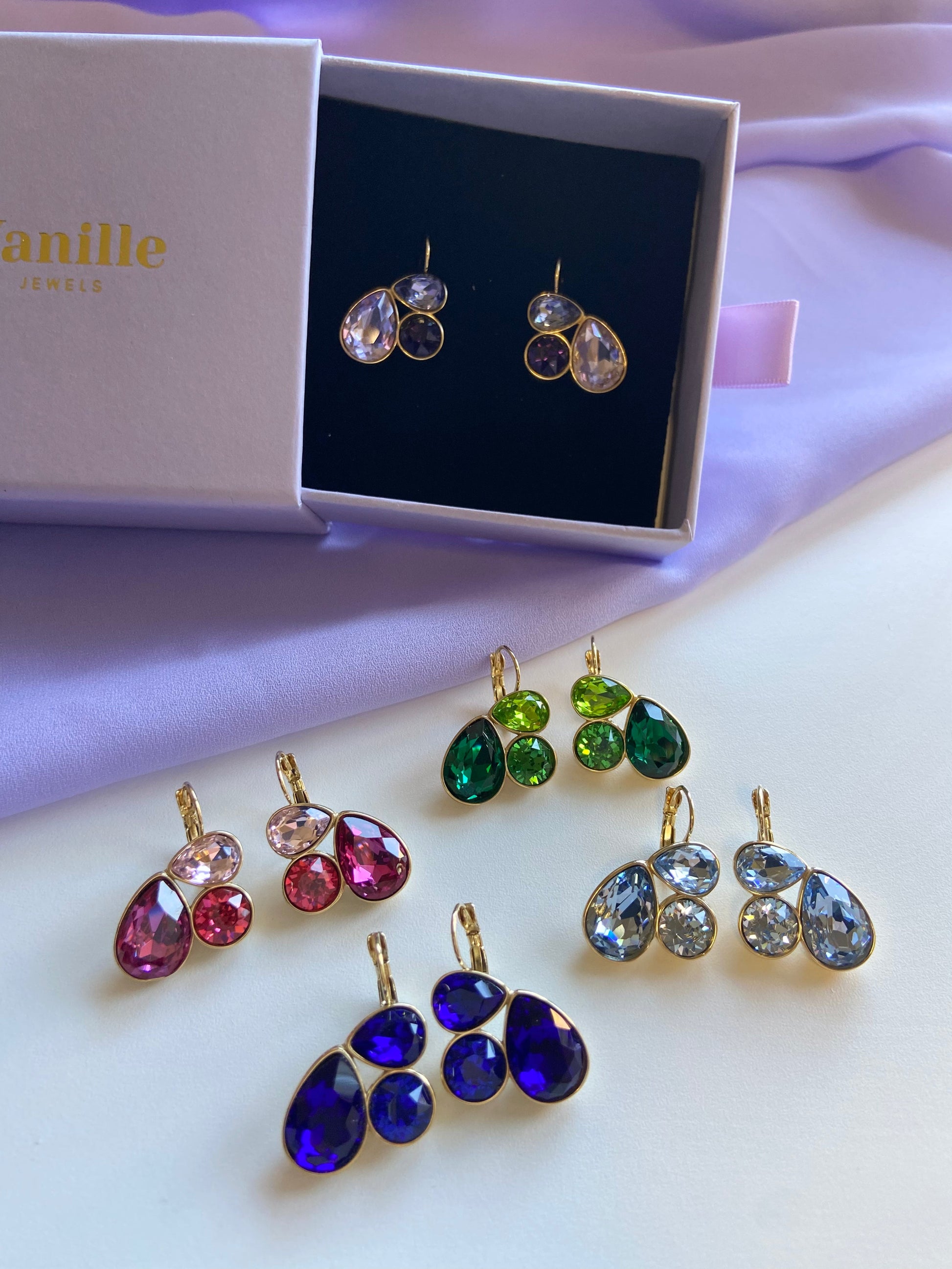 Orecchini con tre zirconi a goccia con chiusura monachella. Disponibile in diversi colori